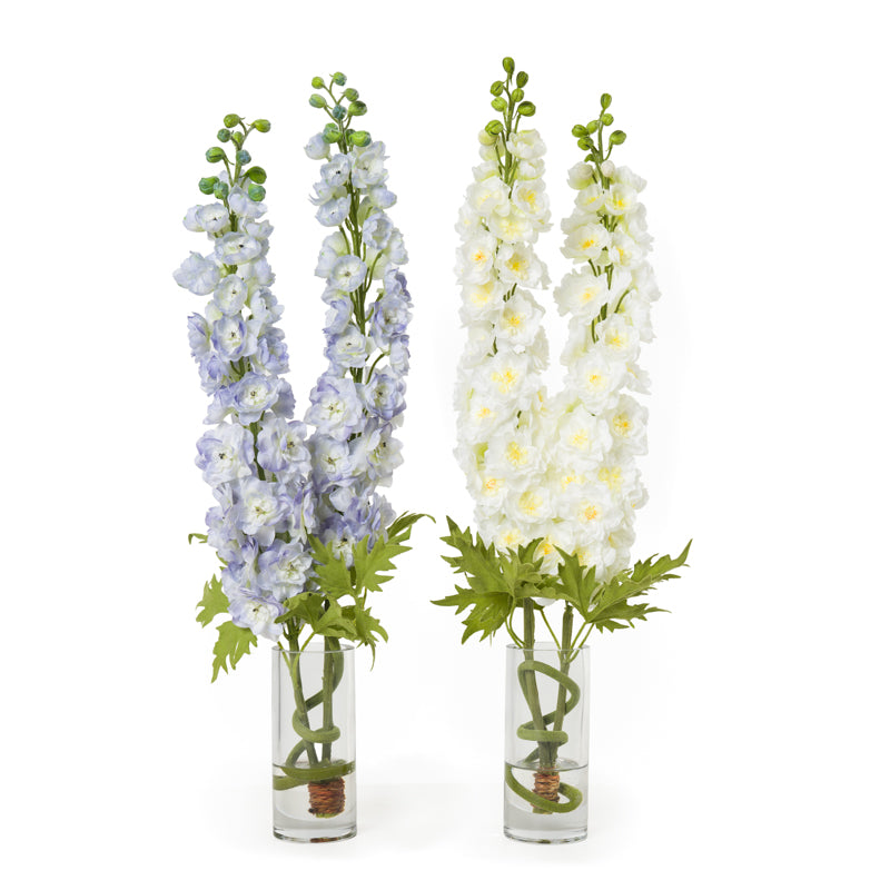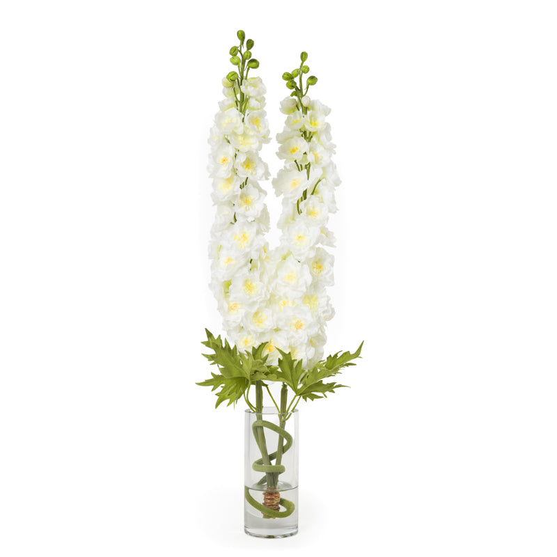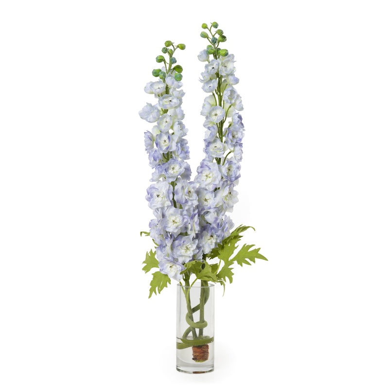 Tall, graceful, and effortlessly refined — this arrangement of lavender or white delphinium stems is set in a clear glass cylinder at 29"H. The delphinium's slender, vertical form brings an airy elegance to any interior, from residential living spaces to boutique hospitality environments.